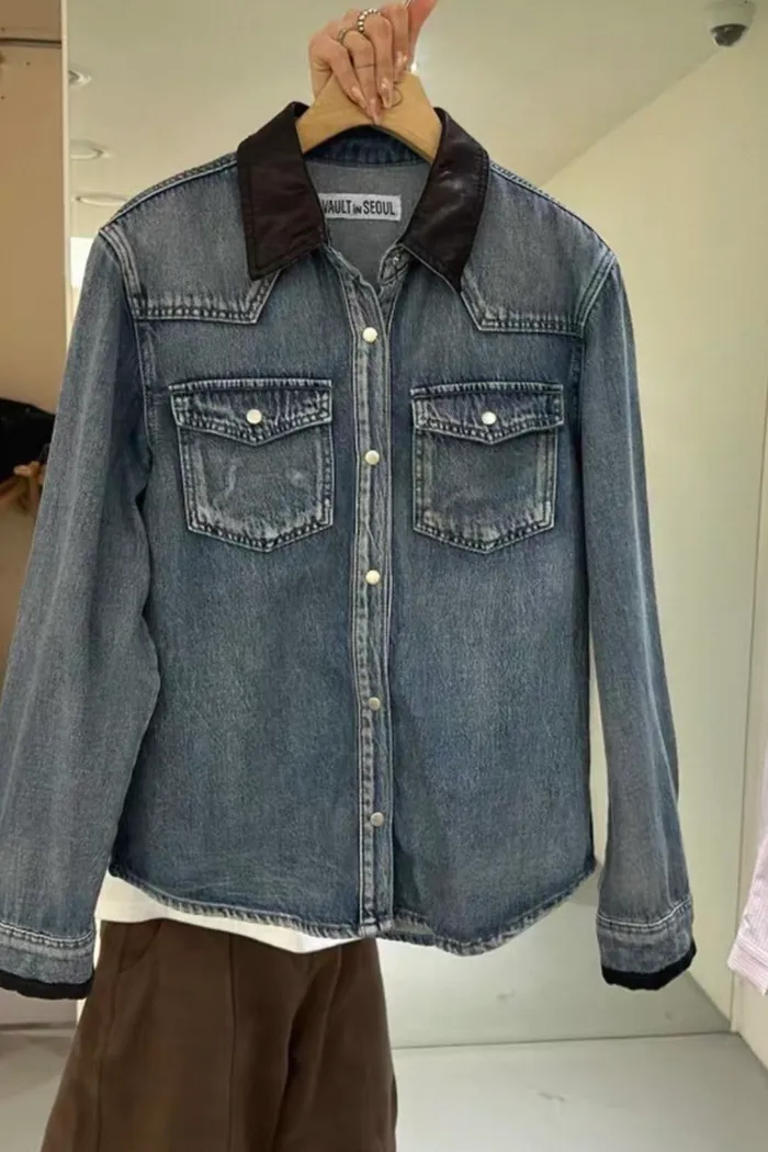 拼接羊皮皮革牛仔襯衫 321